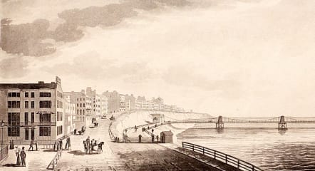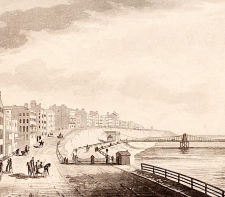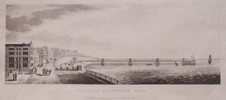Afine aquatint of the Brighton Suspension Pier (or Chain Pier) which was built in 1823, and destroyed in a storm in 1896.