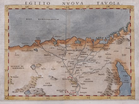 One of the earliest acquirable maps to show the Nile Delta with contemporaneous information; it is also one of the first printed maps to depict the Egyptian Pyramids.