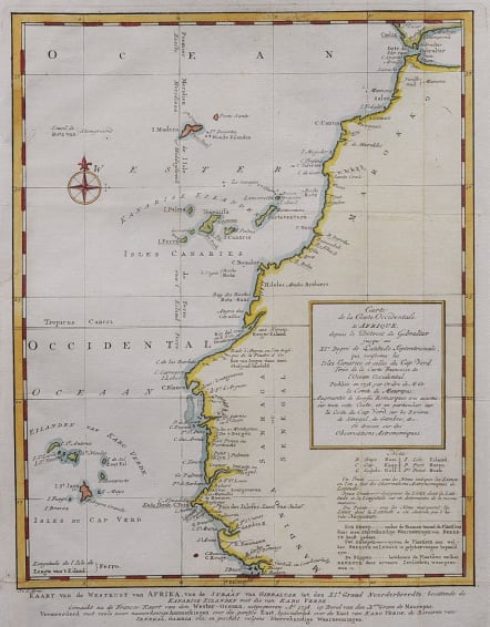 Map of the western coast of Africa, including present-day Morocco, Western Sahara, Mauritania, Senegal, the Gambia, and Guinea-Bissau; includes the Canary Isles, Madiera and Cap Verde Isles.