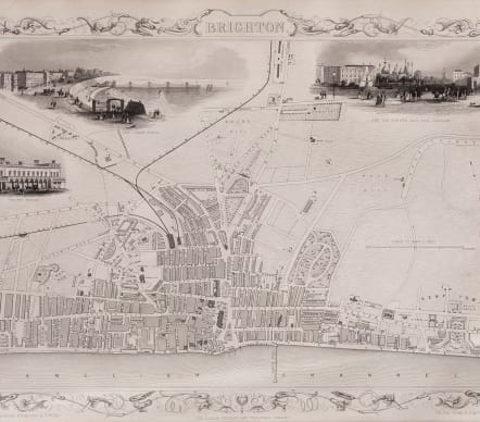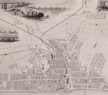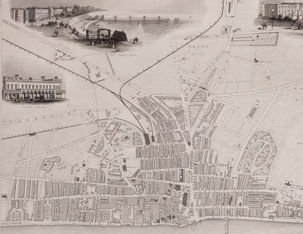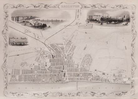 Very decorative mid-Victorian plan with vignettes drawn and engraved by H. Bibby, including View on the Railway Station, The Chain Pier, The Old Steyne and the Pavilion.