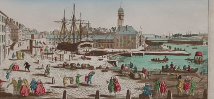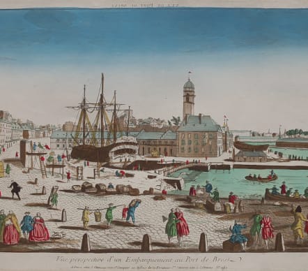 A detailed inventory of Brest society, numerous characters come to enliven the quayside in different scenes: passers-by, porters, sedan chairs, bathers diving into the water, a dog, soldiers chatting in the foreground - one sitting on a trunk; a line of prismatic markers separates the civilian and the military...