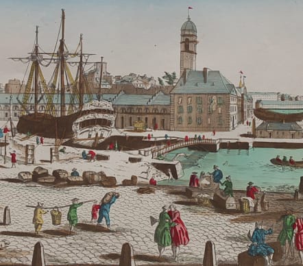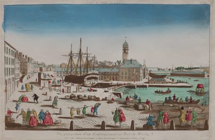 View of the port of Brest, with from right to left, the arsenal buildings (artillery stores / rope makers...), the "general store" and its sundial to the south (built in 1745 on the plans of Choquet de Lindu, on the site of the old "royal store" which had burned down), at the back the "clock tower" crowned with a weather vane, in front the "form of Brest", the first basin built with great difficulty in the mudflats of Troulan, then the main street at the bottom of which a construction site is in progress. A wall is being built there and a gate is being erected to facilitate control and prevent fraud.