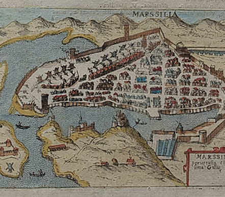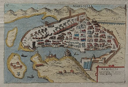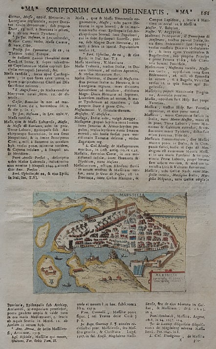 Uncommon small map of Marseille set in a page of latin text. Printed by Alphonsus Lasor a Varea (aka Raffaelo Savonarola), in his ""Universus terrarum orbis sriptorumcalamo delineatus..."" printed in Padua in 1713