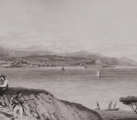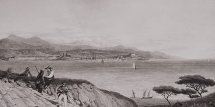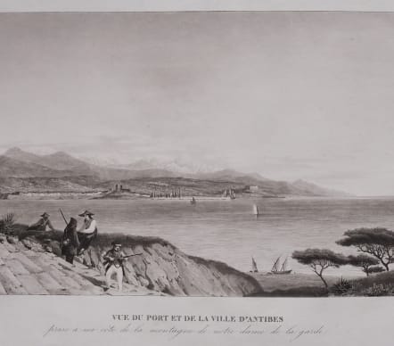 Scene of hunters on the Cap D'Antibes looking towards Antibes with the Alp's behind