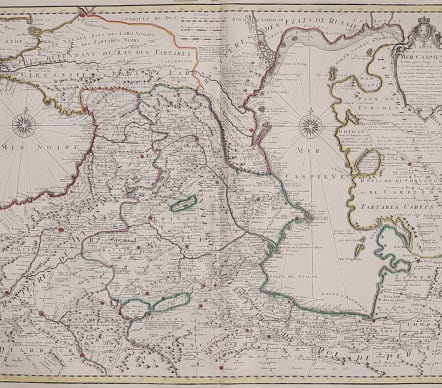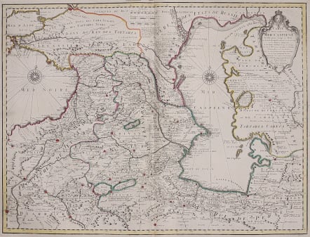 The Caspian Sea was not mapped accurately until the Russian Carl Verden surveyed it in 1722. It was De L'Isle who first published Verden's map: this version places the new information into the general map of the area. So useful for trade and diplomacy in the eighteenth century.