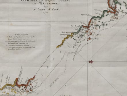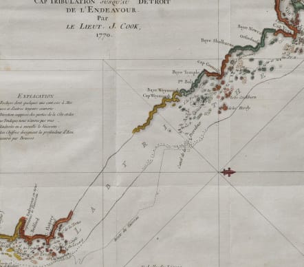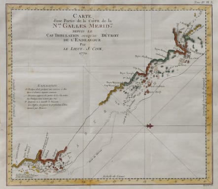 First French edition of the first chart to detail the Great Barrier Reef, discovered by the legendary navigator James Cook during his first voyage aboard the H.M.S. Endeavor . the first French edition of the first chart to detail the Great Barrier Reef, discovered by the legendary navigator James Cook during his first voyage aboard the H.M.S. Endeavor . This west-oriented chart captures the great explorer's difficult journey along the coast of Australia from Cape Tribulation to Cape York, during which he became the first European to navigate - with difficulty, and under duress - the Great Barrier Reef, which he tellingly named 'The Labyrinth.' Cape Tribulation The southernmost extent of this chart is 'Cap Tribulation,' so called by Cook because 'here begun all our troubles.'